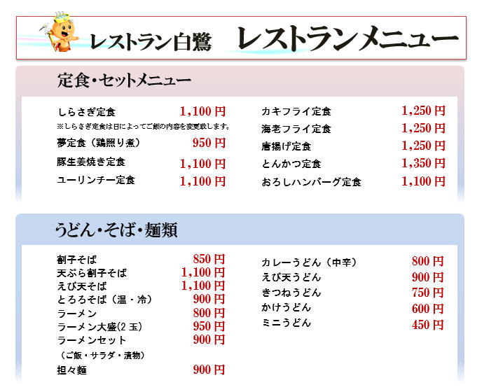 レストランしらさぎ秋のメニュー開始します!ご利用お待ちしております。